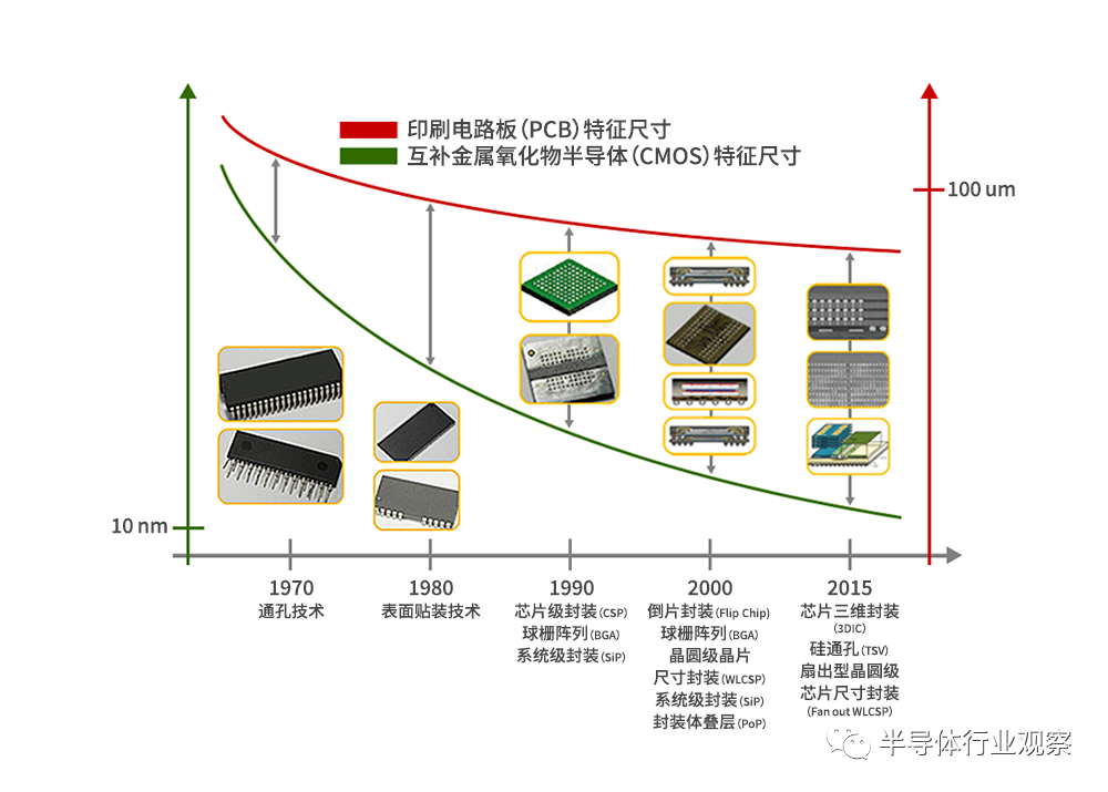 由于主板以面板的形式制造,且受到成本节约策略等因素的影响,印刷电路板的特征尺寸变化不大。然而,随着光刻技术的进步,CMOS晶体管的特征尺寸大幅缩小,这使得CMOS晶体管的尺寸与印刷电路板的尺寸差距逐渐拉大。但问题在于,半导体封装技术需要对从晶圆上切割下来的芯片进行个性化定制,并将其安装到印刷电路板上,因此就需要弥补印刷电路板和晶圆之间的尺寸差距。过去,两者在特征尺寸上的差异并不明显,因而可以使用双列直插式封装(DIP)【11】或锯齿型单列式封装(ZIP)【12】等通孔技术,将半导体封装引线插入印刷电路板插座内。然而,随着两者特征尺寸差异不断扩大,就需要使用薄型小尺寸封装(TSOP)等表面贴装技术(SMT)【13】将引线固定在主板表面。随后,球栅阵列(BGA)、倒片封装、扇出型晶圆级芯片尺寸封装(WLCSP)【14】及硅通孔(TSV)等封装技术相继问世,以弥补晶圆和主板之间不断扩大的尺寸差异。